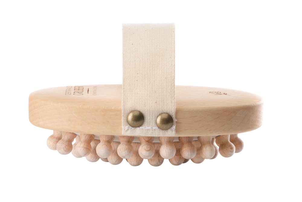 Die Noppen aus Hainbuche sitzen auf einem mit Druckluft arbeitenden Kautschukkissen – dadurch erfolgt eine besonders sanfte, aber zugleich sehr wirkungsvolle Trockenmassage. Regelmäßige Massagen haben eine positive Auswirkung auf das Bindegewebe und bereiten die Haut für die darauffolgende Aufnahme von Pflegeprodukten vor. Der Bürstenkörper ist aus geöltem, FSC ®-zertifiziertem Buchenholz.